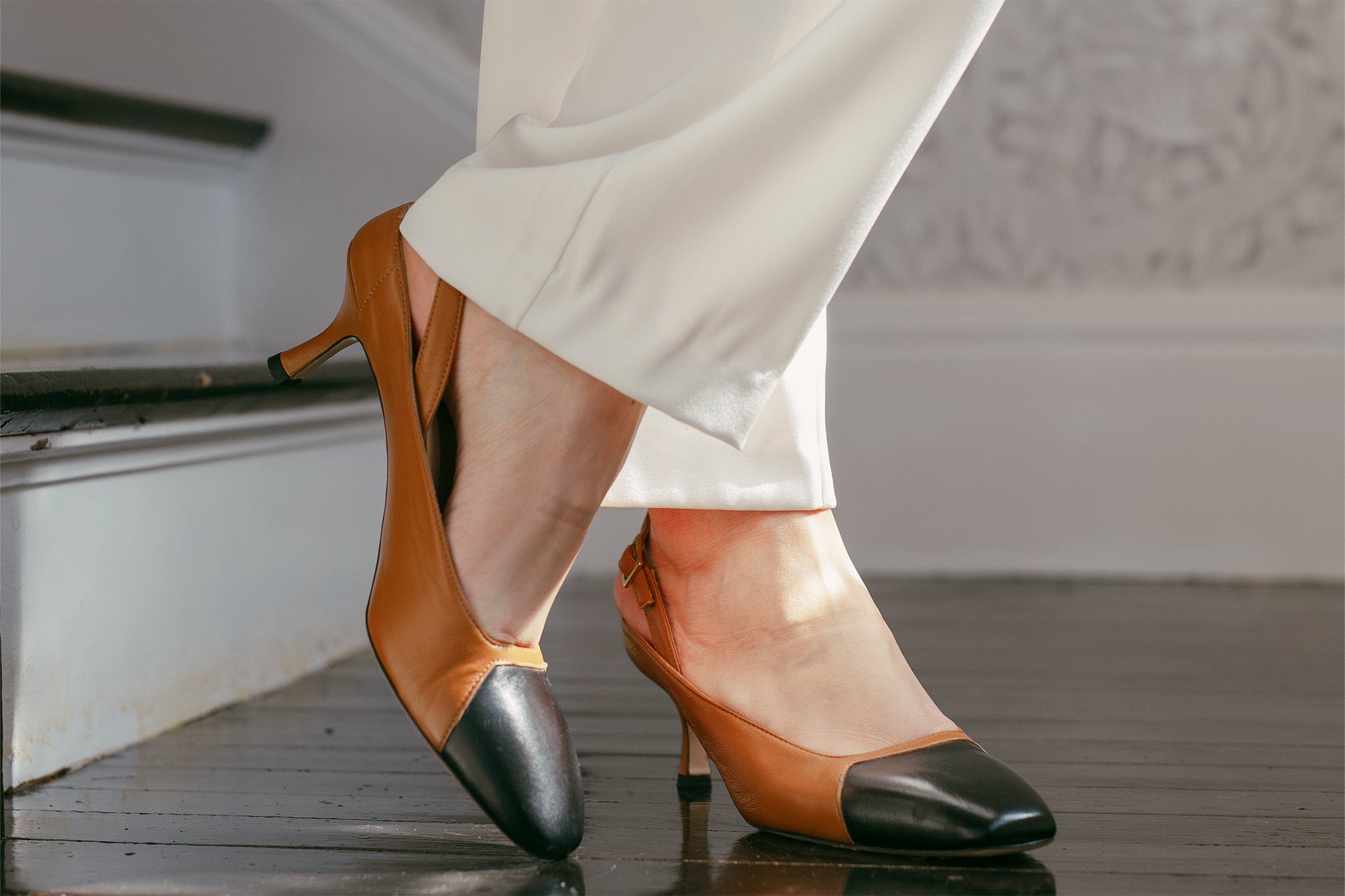 The Narya is a modern take on the classic closed-toe slingback, with a 50 mm heel and elongated square toe for extra comfort.